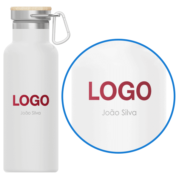 A garrafa de água metálica de parede dupla Traveler possui tecnologia de isolamento a vácuo, concebida para manter a temperatura da sua bebida durante mais tempo. Podemos imprimir o seu logótipo em serigrafia ou gravá-lo a laser na generosa área de marca no corpo da garrafa de água, e também podemos imprimir o seu logótipo na elegante tampa de bambu. A Traveler também possui uma prática alça de transporte para que a possa levar consigo para onde quer que vá.